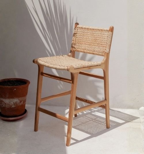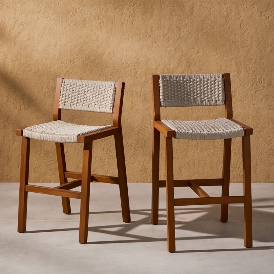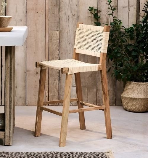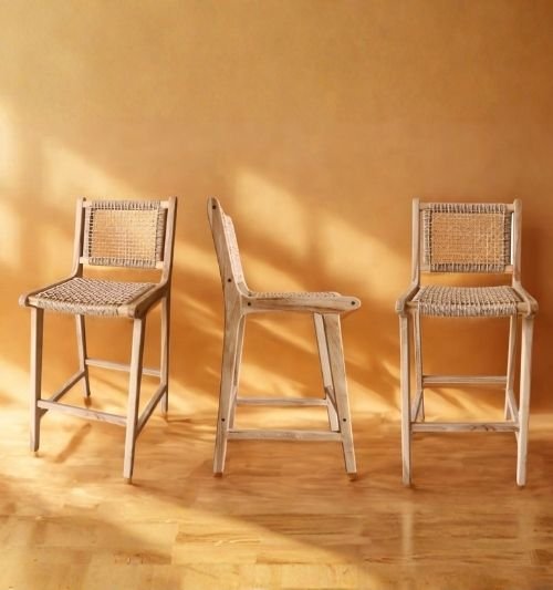 Elegant bar chairs crafted from high-quality teak and recycled wood, featuring antique effects and durable construction suitable for both indoor and outdoor settings.